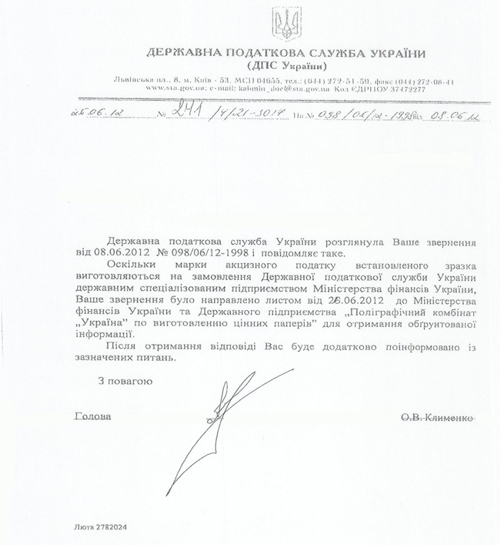 В распоряжении «Багнета» оказался документ подписанный главой Государственной налоговой службы Украины Александром Клименко, который подтверждает желание ведомства разобраться в ситуации и получить ответы на все вопросы, касающиеся печати и распространения ГП «ПК «Украина» акцизных марок без голографического защитного элемента (см. ДОКУМЕНТ). Глава ведомства направил соответствующие запросы на имя руководителей Минфина и полиграфкомбината.