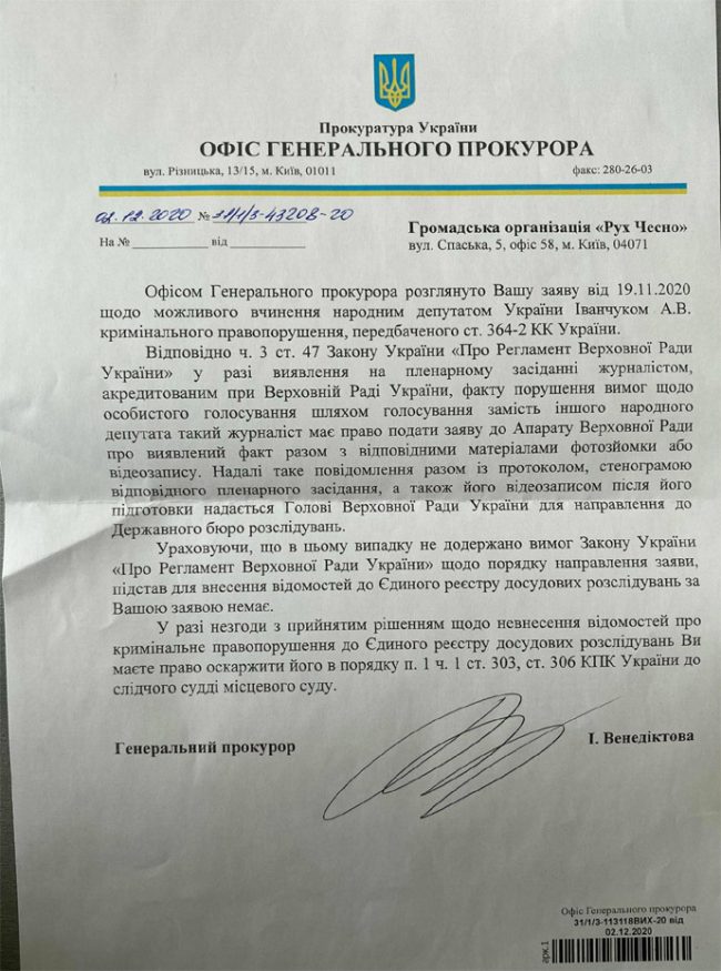 В своем ответе генпрокурор утверждает, что оснований для открытия уголовного производства нет, потому что якобы не были соблюдены требования регламента ВРУ «относительно порядка направления заявления».