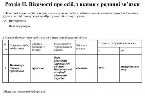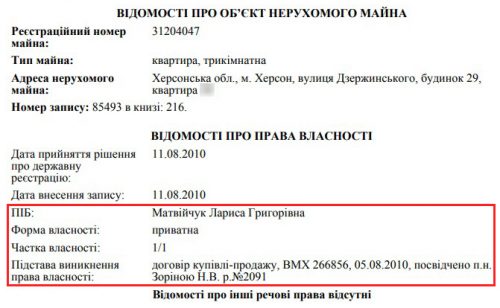 В 2016 году Лариса Матвийчук осуществила отчуждение недвижимого имущества — земельного участка на 500 кв. м в Херсонской области за 149 500 грн. Напомним, что это пороговая сумма наличного расчета.
