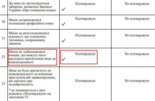 В пункте 22 декларации добродетели кандидат Виктор Матвийчук подтвердил, что он не совершал поступки, которые имели следствие привлечение к ответственности. Однако в 2016 году его вместе с женой оштрафовал полицейский на 255 грн за пересечение двойной сплошной полосы. В итоге Виктор Владимирович отменил протокол в суде.