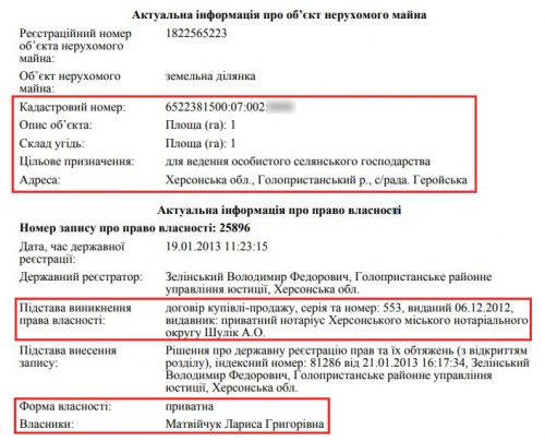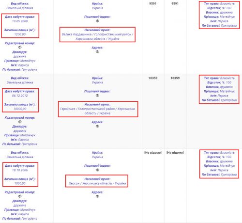 В собственности супругов — три земельных участка в пределах Херсонской области (0,12, 0,10 и 1 га). Наибольший надел был куплен женой прокурора в 2013 году для ведения хозяйства. Стоимость на дату приобретения составляет 10 359 грн.