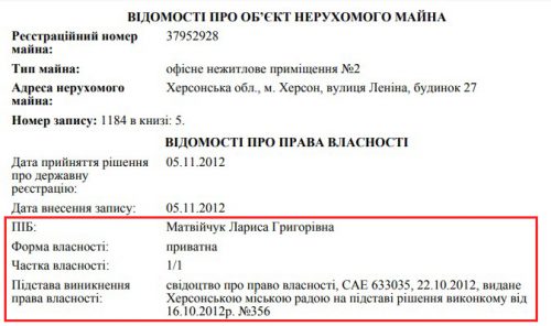 У супругов также есть два гаража, паркинг и офисное помещение в Херсоне на 157 кв. м. Последнее тоже было предоставлено Ларисе Матвийчук Херсонским городским советом на основании решения исполкома. В 2012 году оно стоило до 420 000 грн, или примерно 52 000 долларов.