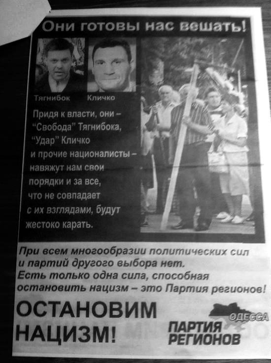 В Одессе распространили листовки с символикой Партии регионов, на которых лидер партии «Свобода» Олег Тягныбок и глава «УДАРА» Виталий Кличко названы нацистами. Также в листовке сообщается, что, придя к власти, Кличко с Тягныбоком будут вешать русских. При этом указано, что остановить наступление нацизма может только Партия регионов.