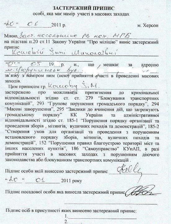 Далі в тексті документу йдеться про те, що «цим приписом громадянина застережено про можливість притягнення до кримінальної відповідальності згідно ст. ст. 279 “Блокування транспортних комунікацій”, 293 “Групове порушення громадського порядку”, 294 “Масові заворушення”, 295 “Заклики до вчинення дій, що загрожують громадському порядку” КК України та адміністративної відповідальності згідно ст. 185-1 “Порушення порядку організації та проведення зборів, мітингів, вуличних походів та демонстрацій”, 185-2 “Створення умов для організації та проведення з порушенням встановленого порядку зборів, мітингів, вуличних походів та демонстрацій”, 152 “Порушення правил благоустрою території міст та інших населених пунктів”, 186 “Самоуправство” КУпАП. в разі прийняття участі в масових заходах з порушенням діючого законодавства або блокуванням транспортних комунікацій».