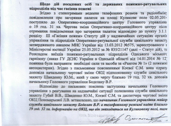 В акте служебного расследования указано: «Как следует из письменных пояснений зам.начальника ГУ ГСЧС Украины в Одесской области полковника службы гражданской защиты Губай В.В., Швиденко Ю.М., Коевой С.М.и диспетчера дежурной смены ОКЦ Пономарёвой Л.В., начальник Главного управления майор службы гражданской защиты Боделан В.Р. в телефонном режиме предоставил приблизительно в 19:32 ч. Информацию, что он находится на Куликовом Поле, там происходит силовое противостояние, технику и личный состав направлять только по его команде. Дежурная смена, выполняя его устный приказ, не направила пожарно-спасательное подразделение к месту вызова».