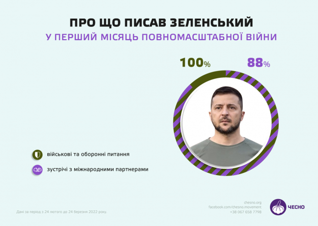 Тематически большинство сообщений на странице касаются встреч Зеленского с международными партнерами, а также соглашений с ними о помощи. В первый месяц полномасштабного вторжения таких сообщений было 88%.