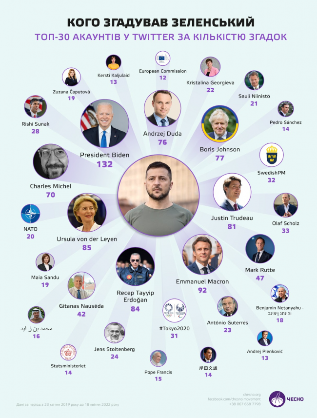 Лидером по количеству упоминаний на странице Зеленского стал Джо Байден – он был отмечен 132 раза. Также в топ вошли Эманнуэль Макрон и Урсула фон дер Ляен, президент Европейской комиссии.