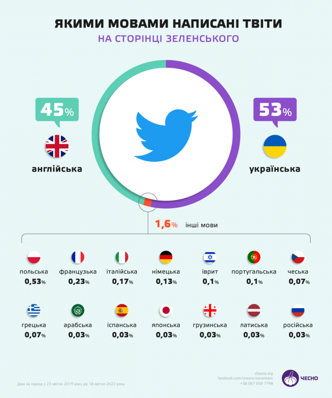 Также значительно увеличилось количество сообщений на иностранных языках, особенно на английском. Она составляет более половины всех твитов на странице. Кроме украинского, есть сообщения написаны также на польском, французском и других языках.