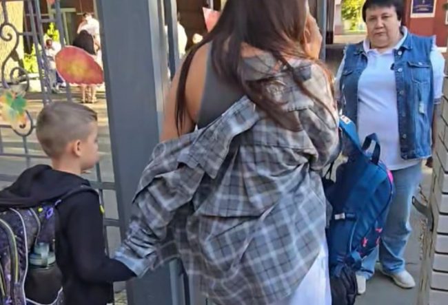 Женщина встала в воротах при входе на территорию учебного заведения в сопровождении охранника и разворачивала назад тех, кто не прошел ее дресс-контроль.