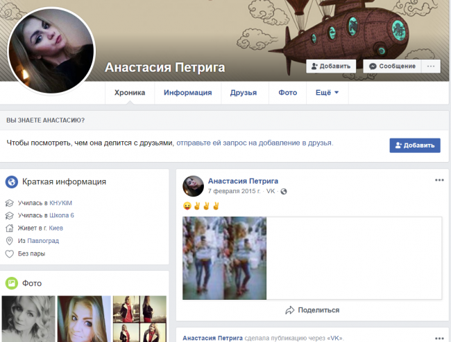 Аккаунт Петриги в соцсетях неактивен с 2015 года. Она из Павлограда, училась в КНУКИМ.