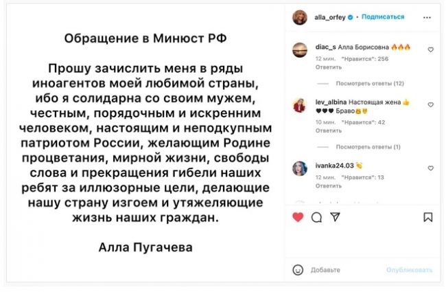 16 сентября министерство юстиции России объявило «иностранным агентом» комика Максима Галкина — мужа певицы Аллы Пугачевой, который вступает против войны. По версии Минюста, Галкин занимается политической деятельностью на деньги из Украины. Сам комик прокомментировал это словами: «Я торговлей совестью не занимаюсь». 18 сентября Алла Пугачева попросила признать ее «иноагентом» вслед за мужем — «честным, порядочным и искренним человеком, настоящим и неподкупным патриотом России», который желает своей стране «мирной жизни, свободы слова» и прекращения гибели людей «за иллюзорные цели». Свое заявление Пугачева опубликовала в инстаграме, оно собрало больше полумиллиона лайков. Его процитировали, пожалуй, все российские медиа — правда, те из них, которые так или иначе подконтрольны Кремлю, не упомянули слова, отсылающие к войне в Украине. Вот какие реакции собрал пост Пугачевой.