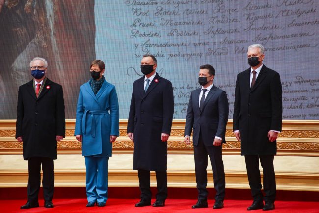 В понедельник, третьего мая, президент Украины Владимир Зеленский посетил Польшу, где принял участие в праздновании 230-летия принятия первой Конституции Речи Посполитой. В мероприятии также принимали участие президент Республики Польша Анджей Дуда, президент Эстонской Республики Керсти Кальюлайд, президент Литовской Республики Гитанас Науседа и президент Латвийской Республики Эгилс Левитс. Они подписали совместную декларацию по случаю 230-й годовщины принятия первой польской конституции. В документе указывается, что лидеры пяти государств встречаются сегодня в Варшаве, чтобы совместно отметить 230-ю годовщину принятия Конституции Польши. Там отмечено, что успех общего наследия требует, чтобы Европа строилась на фундаментальных принципах и ценностях, к которым относятся: свобода, суверенитет, территориальная целостность, демократия, верховенство права, равенство и солидарность. Европа должна быть открытой для всех стран и народов, которые разделяют такие ценности, сказано в документе. Кроме того, там указано, что солидарность народов в условиях современных угроз является одним из краеугольных камней мира, стабильности и развития.