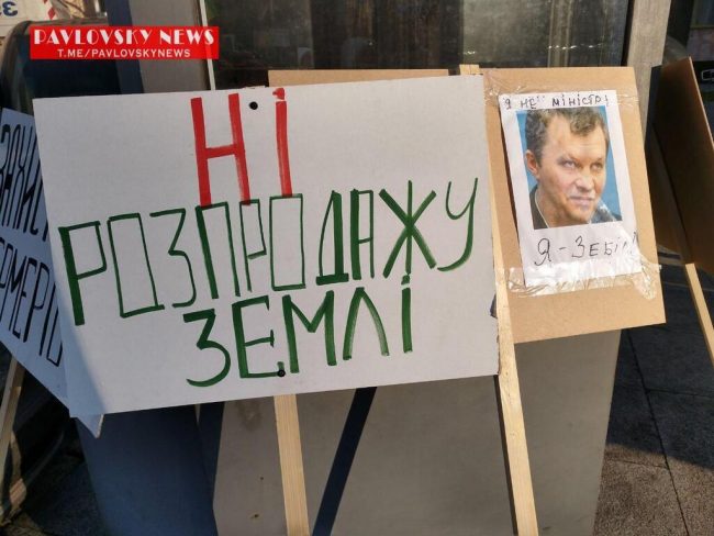 Около 50 митингующих держат различные плакаты, в том числе «Нет – дерибану земли!»