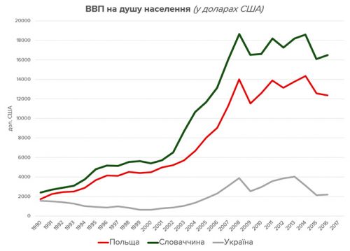 Ускорение после 2003 года значительно усилило разрыв в размере ВВП между Украиной и соседями. Результат для Украины неутешителен, потому что пока соседские экономики стабильно росли, украинская так и осталась примерно на стартовом уровне 1990 года.