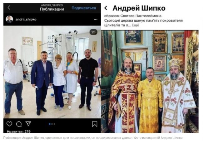 Так, за день до аварии, 7 августа, Андрей Шипко опубликовал на своих страницах в Facebook и Instagram фотографии из Днепра. Как он сам сообщил в сопроводительном тексте, в этот день Шипко находился в командировке в Украинском государственном научно-исследовательском институте медико-социальных проблем инвалидности, где обсуждал проблемы онкобольных пациентов. На следующий день после аварии, 9 августа, Шипко и вовсе выложил свое фото в церковном одеянии в компании священнослужителей.