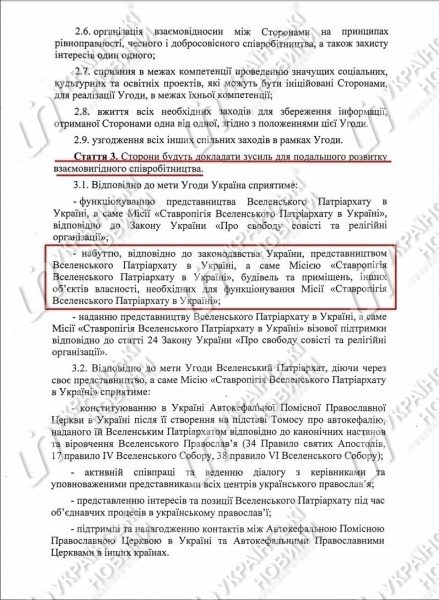 «В соответствии с целью соглашения, Украина будет способствовать. приобретению, в соответствии с законодательством Украины, представительством Вселенского патриархата в Украине, а именно миссией «Ставропигия Вселенского патриархата в Украине», зданий и помещений, других объектов собственности, необходимых для функционирования миссии «Ставропигия Вселенского патриархата в Украине»,