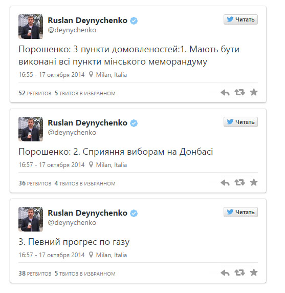 О том, что идут переговоры о соблюдении на территории Донбасса минских договоренностей заявил и Петр Порошенко. Помимо этого он сообщил, что также обсуждается вопрос проведения выборов в Донецкой и Луганской области, а также решаются газовые вопросы. По его словам, более-менее, конструктивный результат наметился в третьем вопросе, Украина думает над тем, где изыскать средства и каким образом оплатить свои обязательства перед Россией.