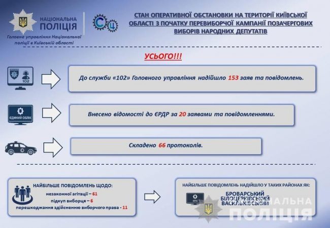 По состоянию на начало июля в Нацполицию поступило свыше 150 заявлений о нарушениях закона о выборах. Из них шесть сообщений о подкупе, 61 – о незаконной агитации и 11 – о препятствовании осуществлению избирательного права.