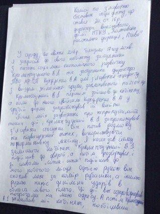 Напомним, что 28 апреля 2016 года директор полтавского телеканала «Лтава» Евгений Лопушинский был доставлен в Полтавскую райбольницу с двумя ножевыми ранениями в область сердца. Очевидцы, а также полтавские СМИ утверждали, что довел журналиста до попытки самоубийства губернатор Полтавщины Валерий Головко и его родственник по фамилии Руслан Кременчугский. Причина — В. Головко любым способом пытался получить полный контроль над телерадиокомпанией «Лтава» и “давил” на гендиректора Е. Лопушинского, который не соглашался делать «заказные материалы» и назначать Р. Кременчугского первым заместителем. Ниже — копия заявления Лопушинского, в котором он собственноручно описывает детали инцидента, который произошел между ним и Кременчугским 20 апреля.