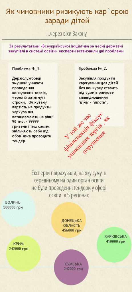 Проблема № 1. Чиновники-освітяни змушені уникати проведення відкритих торгів, через розтягнутість у часі. Як наслідок, ризикуючи власними посадами, держслужбовці вдаються до хитростей. Відповідно до статті 2 Закону України «Про здійснення державних закупівель» відкриті торги необхідно проводити, якщо очікувана вартість товару(яку замовник визначає самостійно) становить 100 тисяч гривень або більше. Якщо визначена вартість менше 100 тисяч, тоді замовник не проводить торги, а власноруч визначає постачальника. Така процедура називається «підпорогові» закупівлі. У 5-ти областях із 64 конкурсних комітетів управлінь, відділів у сфері освіти та шкіл, підпорогові закупівлі виявлені у 46(71,9%). Варто відзначити, що моніторинг охопив всі регіони України. У Волинській області середня сума «підпорогових» на один орган освіти складає більше 500 тис. гривень. На Донеччині - 456 тис. гривень. В Харківській області - 410 тис. гривень. В Криму – 242 тис. гривень. На Сумщині – також близько 242 тисячі. Таким чином, сума підпорогових закупівель, по яким не проводили торги на одну область може сягати десятки мільйонів бюджетних коштів.