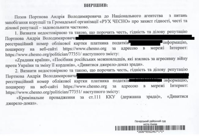 Суд признал недостоверной информацию, которую движение «Честно» распространило о юристе Андрее Портнове, постановил ее опровергнуть, удалить профиль и изображение Портнова, а также выплатить ему 240 тыс. гривен компенсации.