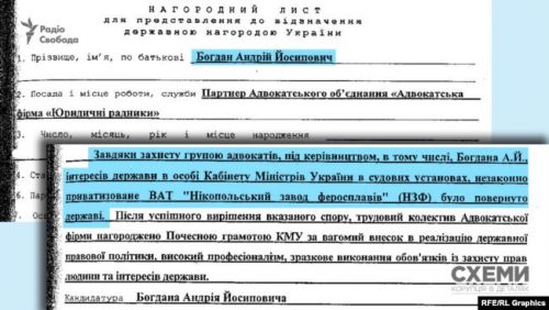 «Благодаря защите группой адвокатов, под руководством, в том числе Андрея Богдана, интересов государства в лице Кабмина в судебных учреждениях, незаконно приватизированное ОАО Никопольский завод ферросплавов было возвращено государству», – говорится в документе.