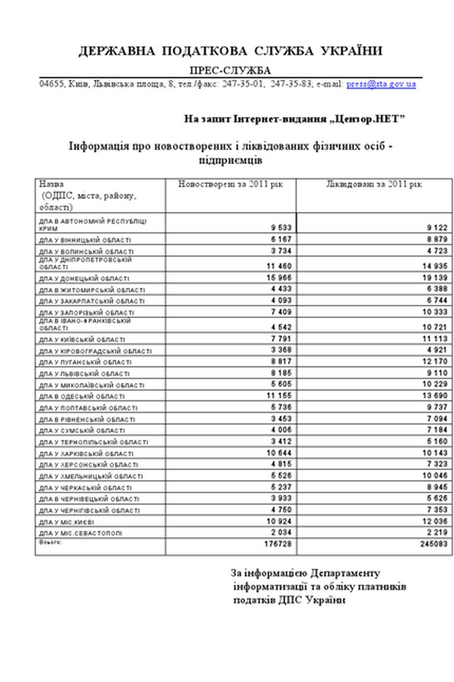 «Цензор.НЕТ» получил ответ на свой запрос от Государственной налоговой службы. Из него следует - за 2011 год закрыли свой бизнес 245 000 предпринимателей.