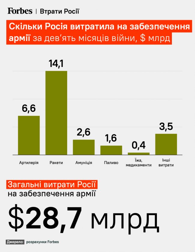 Прямые военные расходы России за 9 месяцев войны, по расчетам Forbes, составляют примерно 82 млрд долларов. Эта оценка включает в себя непосредственные расходы, необходимые для поддержки военных действий. Но не включает стабильные расходы на оборону, или потери связаны с экономикой.