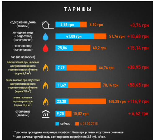 В каждом регионе действуют разные тарифы на отопление и горячую воду, так как они отданы "на откуп" местным властям. Например, если в Киеве сейчас тепло стоит 9,22 грн/кв.м, а горячая вода – 25,1 грн/куб.м, то с 1 апреля 2015 года киевляне заплатят за отопление 15,8 грн/кв. м (дороже на 72%) и 40,2 грн/куб.м (дороже на 60%).
