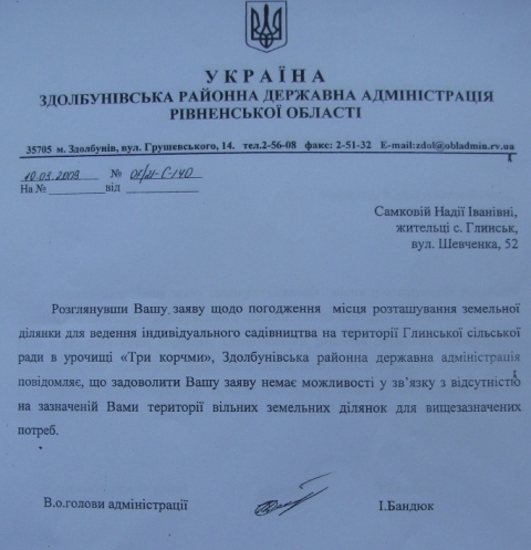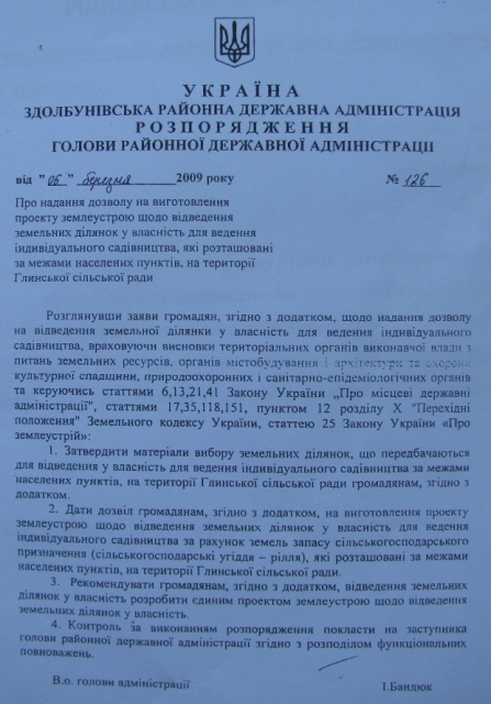 Однако уже через полгода Игорь Владимирович положил глаз на ещё один лакомый земельный кусочек – участок в урочище «Три корчми» на территории Глынского сельсовета. Согласно распоряжению председателя Здолбунивской райгосадминистрации №126 от 06.03.2009 г. Игорю Ольшанецкому бесплатно передали в собственность земельный участок для ведения индивидуального садоводства (!) – 0,12 га в каких нибудь 15 км от обласного центра.
