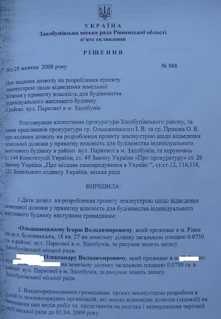 Но даже в нелегких прокурорских буднях, за заботами о хлебе насущном с икоркой, Игорь Ольшанецкий успевает заниматься любимым делом — обзаводиться недвижимостью. А поскольку, как мы помним, две квартиры в Ривном у молодого прокурора уже имеются, то в Здолбунове он решил приступить к строительству дома. Местный горсовет своим решением №988 от 29.10.2008 г. безропотно и безвозмездно выделил Игорю Ольшанецкому 0,075 га из земель запаса в парковой зоне г.Здолбунив.