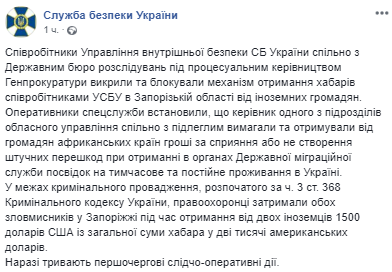 Отмечается, что сотрудники управления внутренней безопасности СБУ и ГБР «блокировали механизм получения взяток сотрудниками УСБУ в Запорожской области от иностранных граждан».