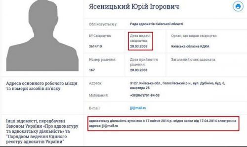 Также известно, что в период 2008-2014 годов Юрий Ясеницкий был зарегистрирован адвокатом. К сожалению, информации о том, работал ли в течение этого времени Юрий Игоревич прокурором, имеется. Поэтому надеемся, что это выяснят Соответствующие Правоохранительные органы, ведь совмещение должностей прокурорами является нарушением законодательства. Также благодаря системе YouConrol мы узнали, что в течение 2009-2014 годов прокурор был руководителем «ЮРИДИЧЕСКАЯ ГРУППА« прецедент »и два года был зарегистрирован физическим лицом-предпринимателем.
