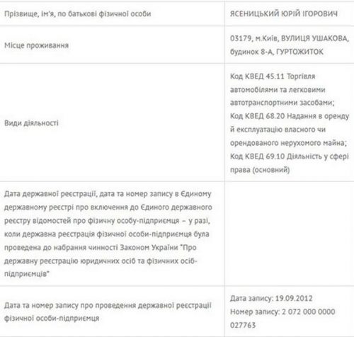Мы также решили узнать, кем работают родители Юрия и Юлии Ясеницкий. Мать Юлии — Светлана Ивановна Яхно — зарегистрирована физическим лицом-предпринимателем и занимается торговлей текстильным товарами. Кстати, Светлана Ивановна также значится владельцем новенького авто — Audi Q7 2017 года выпуска. Подобный автомобиль сегодня стоит ок. 70 тыс. долл. Отец Юлии тоже занимается бизнесом — является ФЛП-ом и владельцем ООО «Искра».