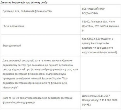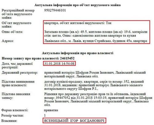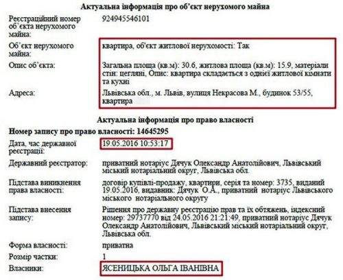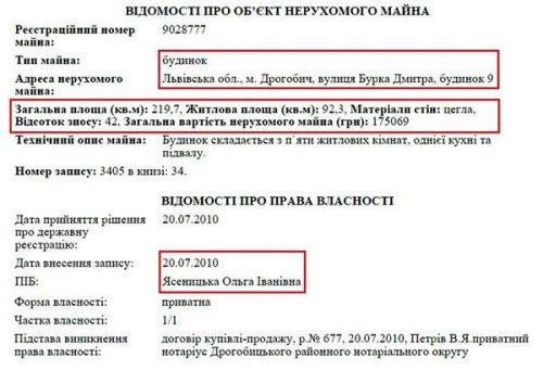Кроме этого жилья, Ольга Ивановна Ясеницкая является владельцем квартиры во Львове по адресу: ул. Некрасова, 53/55. Также мать прокурора владеет домом площадью 219 кв. м. в Дрогобыче и двумя нежилымы помещениями.