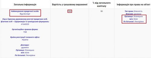 Большинство своих доходов гр-ну ка Ясеницкая получила от Предпринимательское деятельности. В декларации указано, что она является совладельца компании «Фуд Экспорт», куда положила 500 грн. Зарегистрирована эта компания только в ноябре 2017 года, основным видом ее деятельности указана оптовая торговля овощами и фруктами. Несмотря на молодой возраст, компания уже несколько раз меняла учредителей и юридический адрес.
