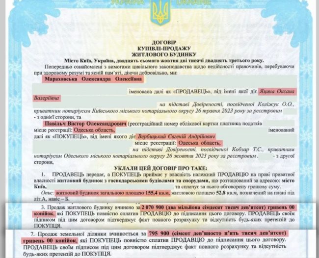 «26 октября 2023 года Павильч выдал племяннику Вербицкого Евгению доверенность на представительство интересов, а уже на следующий день, 27 октября, Евгений Вербицкий оформил право собственности на таунхаус вместе с землей на имя Павильча», – говорится в расследовании.