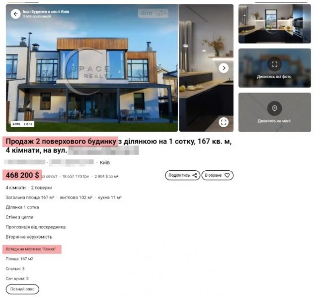 Сумма сделки составила 2,8 млн грн: 2 млн за дом и 800 тыс. за землю, свидетельствуют договоры купли-продажи, которые есть в распоряжении журналистов. При том, что рыночная цена такого же таунхауса, согласно объявлениям о продаже, составляет около $470 тыс., или более 18,5 млн грн. Также журналисты связались с представительницей застройщика, чтобы уточнить стоимость имущества площадью 155 кв. м. Она ответила, что «ниже $200 тыс.» такие дома в «Конике» «точно не продают».