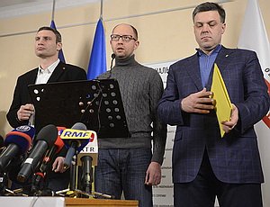 Издание пишет, что все трое лидеров оппозиции – Виталий Кличко, Арсений Яценюк и Олег Тягнибок – «оказались в недоумении относительно того, как реагировать». СМИ имеет в виду отсутствие видимых уступок со стороны Януковича Кремлю, который предоставил Украине помощь.