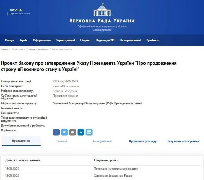 В Верховной Раде Украины 18 мая зарегистрировали проекты законов о продолжении военного положения в Украине после 24 мая и о продолжении всеобщей мобилизации.