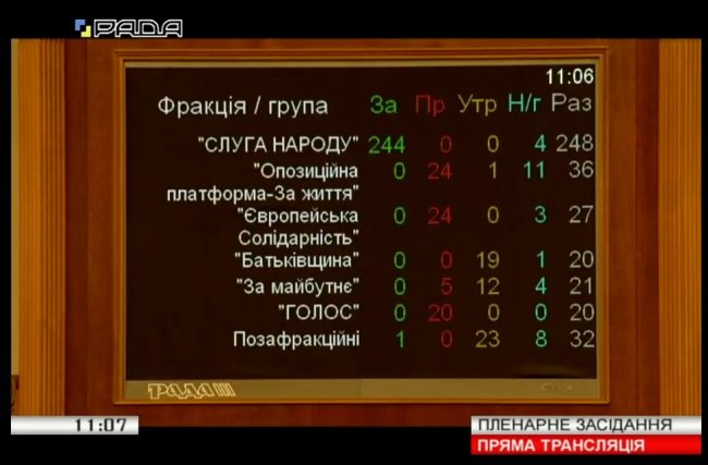 За соответсвующее решение на заседании парламента во вторник, 10 сентября, проголосовали 245 народных депутатов, из которых 243 —нардепы от фракции «Слуга народа», позафракционные — спикер Рады Дмитрий Разумков и его первый заместитель Руслан Стефанчук.