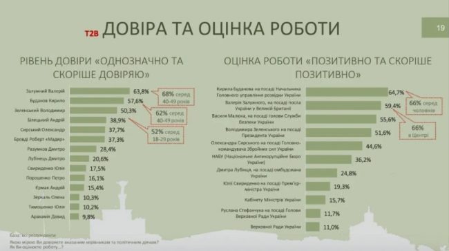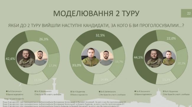 Если же соревновались бы Залужный и Буданов, то преимущество снова на стороне бывшего главнокомандующего ВСУ – 44,5% против 22% у Буданова. Еще 20,2% ответили, что им трудно выбрать, а 13,3% не приняли бы участия в голосовании.