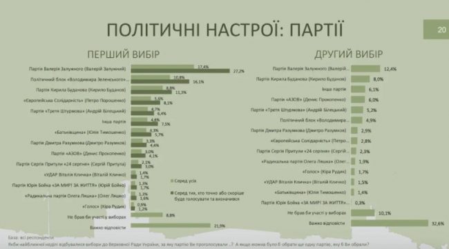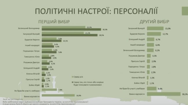 Несмотря на результаты второго тура, в стартовом этапе выборов Зеленский пока сохраняет лидерство. За него готовы проголосовать 30,3% среди тех, кто определился с выбором. На втором месте – Залужный с 28,5%, на третьем – Буданов с 10,1%.