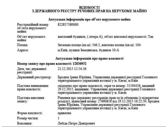 По данным YouControl , в целом же физическое лицо «Петр Дмитриевич Лебедь» владеет семью объектами недвижимости, четыре из которых — на Киевщине. Речь идет о доме в селе Вороньков по ул. Украинская, 127. В том же селе Лебедь имеет дом по ул. Молодежная, 46. И соответственно — двумя земельными участками (кадастровые номера — 3220881701:01:003:0074 и 3220881701:01:003:0075 ). Эти активы под Киевом и Борисполем тоже стоят десятки миллионов гривен .