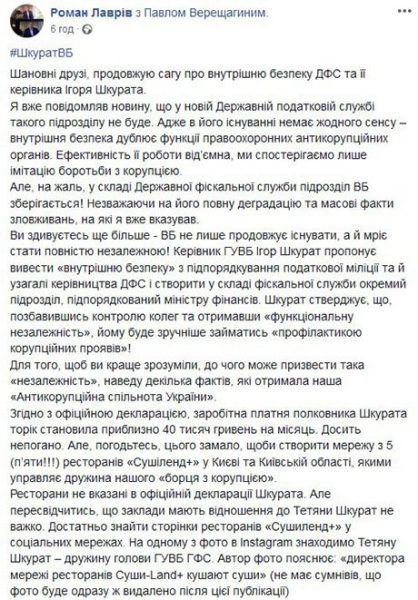 «Интересный факт: после того, как Игорь Шкурат возглавил ГУВБ ГФС, доходы его жены-предпринимателя выросли в четыре раза !!! Интересное совпадение? Чем активнее господин Шкурат ведет борьбу с «проявлениями коррупции», тем более у его второй половине ресторанов», — говорит Лаврив.