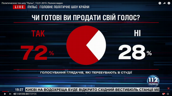 Наконец, недавно один из топовых телеканалов несколько эфирных часов готовил почву для скупки голосов, усыпляя совесть зрителей и оправдывая продажность. У хозяина канала Виктора Медведчука считают, что 72 % аудитории готовы продать голос.