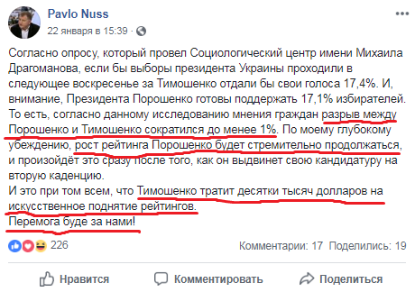 На скриншоте – вот так выглядит пропаганда со страниц порохоботов, как бы «ненавязчиво» выдавая заказчиков исследований сомнительного качества. «Разрыв меньше 1% и рост рейтинга Порошенко будет продолжаться!»