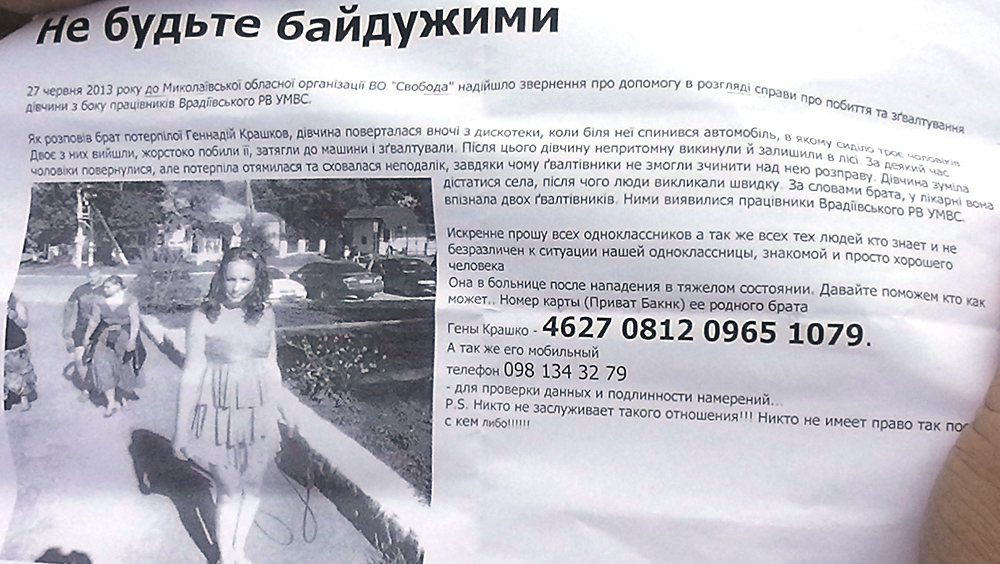 Ранее сообщалось, что жители пгт Врадиевка Николаевской области вышли на акцию протеста 30 июня с требованием наказать двух сотрудников милиции, которые подозреваются в изнасиловании и нанесении тяжких телесных повреждений молодой женщине.