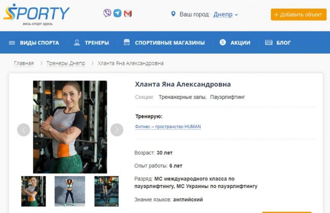 34-летняя профессиональная спортсменка, мастер спорта по пауэрлифтингу. Сейчас она работает тренером в фитнес-клубе Human в центре Днепра.