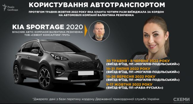 Уже после начала полномасштабного вторжения РФ Яна Хланта больше не пересекала границу вместе с Резниченко. Но 4 раза она уезжала за пределы Украины сама на автомобиле Kia Sportage. «Схемы» установили, что владелец автомобиля – компания, которая на 100% принадлежит главе Днепропетровской ОВА, ее название – «Севент Консалтинг Групп» .